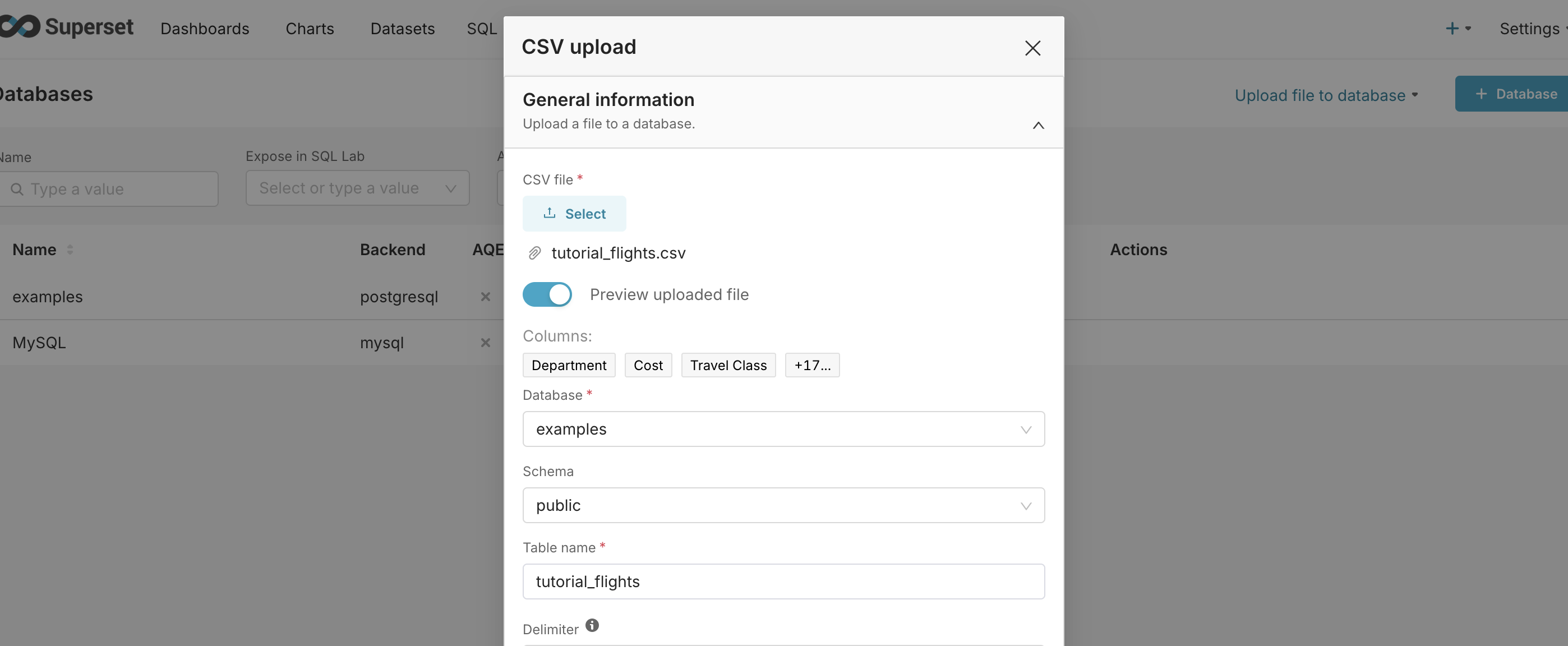 In this tutorial, we will introduce key concepts in Apache Superset through the exploration of a real dataset which contains the flights made by employees of a UK-based organization in 2011. The following information about each flight is given: